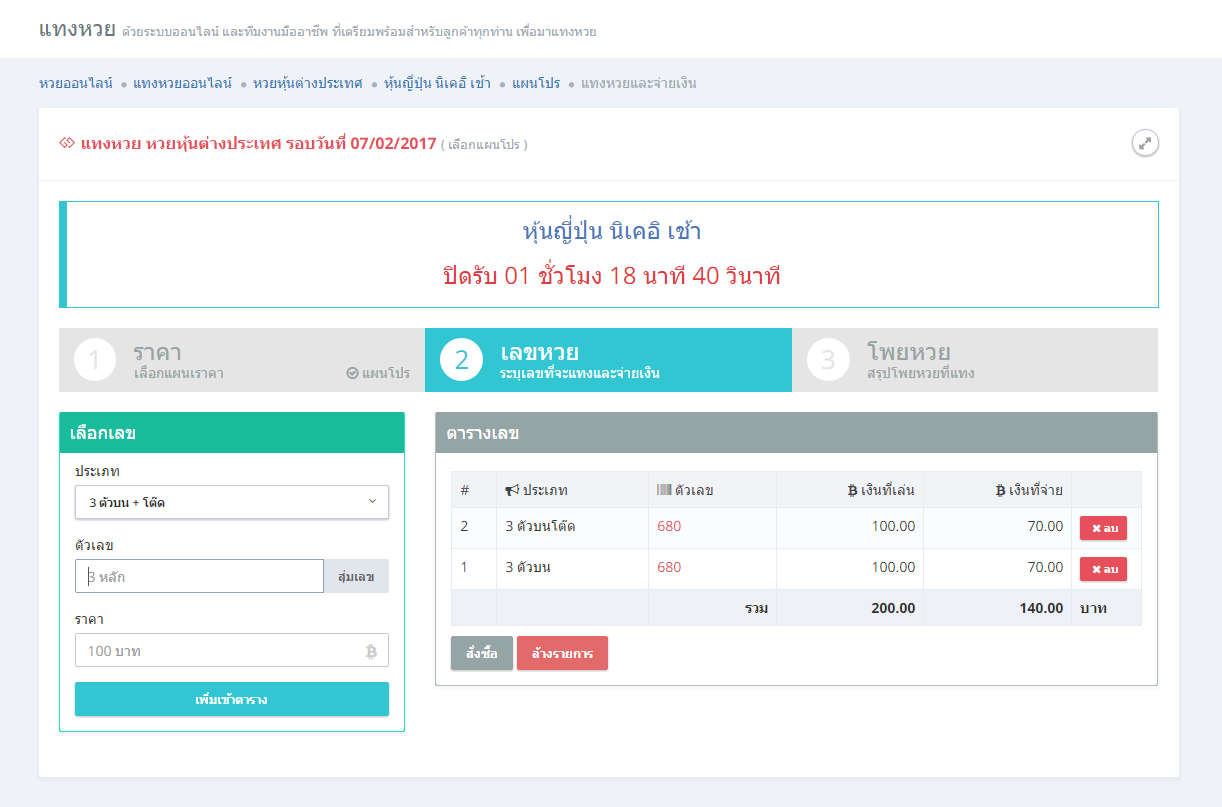 ระบุประเภท ตัวเลขพร้อมราคาเพื่อแทงหวย กดสั่งซื้อเพื่อยืนยัน